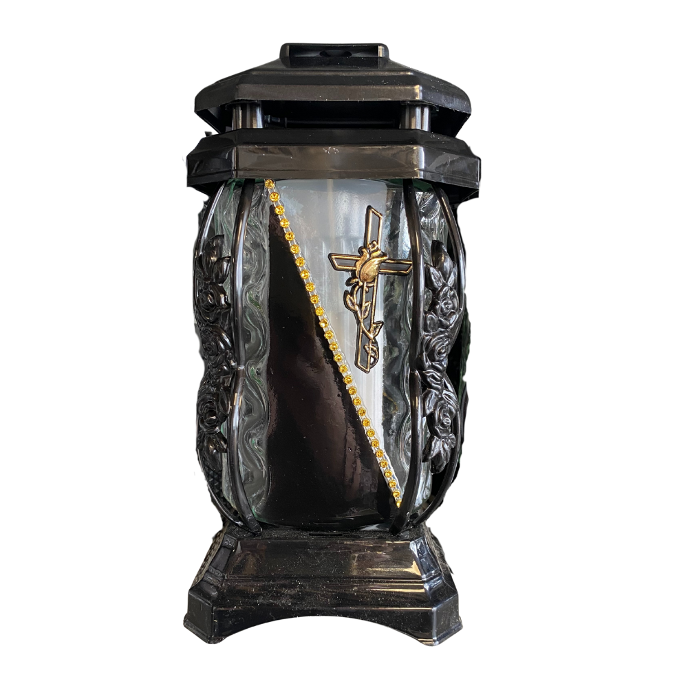 - Uctite si pamiatku svojich blízkych s kahancom so sviečkou v čierno zlatom prevedení, ktorý zdobí kríž ako symbol viery, nádeje a večného života